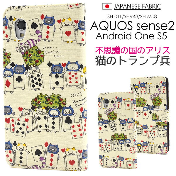 メール便送料無料【 AQUOS sense2 SH-01L/SHV43/SH-M08/Android One S5 不思議の国のアリス 猫のトランプ兵手帳型ケース 】2018年冬モデル アクオス センス ツー Sharp シャープ 手帳型 横開き 二つ折り 背面スタンド カードポケット ねこ かわいい